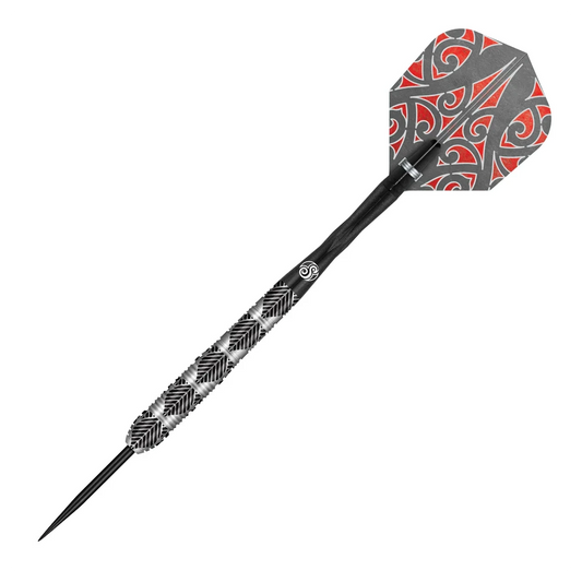 The dart features a tattoo-inspired sleeve that wraps elegantly around the barrel, finely laser-etched. The barrel itself has a double-toothed ring grip that tapers from the center to the tail, providing an assured, front-loaded balance.