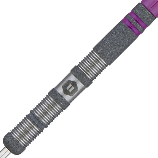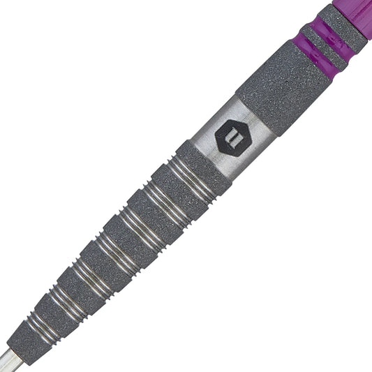 Unicorn Amethyst Darts - Steel Tip - Utech - Sandblasted. Crafted with 90% tungsten, these Utech series darts boast a unique sandblasted finish for enhanced grip. The barrel features a distinctive double purple ring at the rear, adding a stylish touch. Comes complete with Ultrafly flights and Gripper shafts.