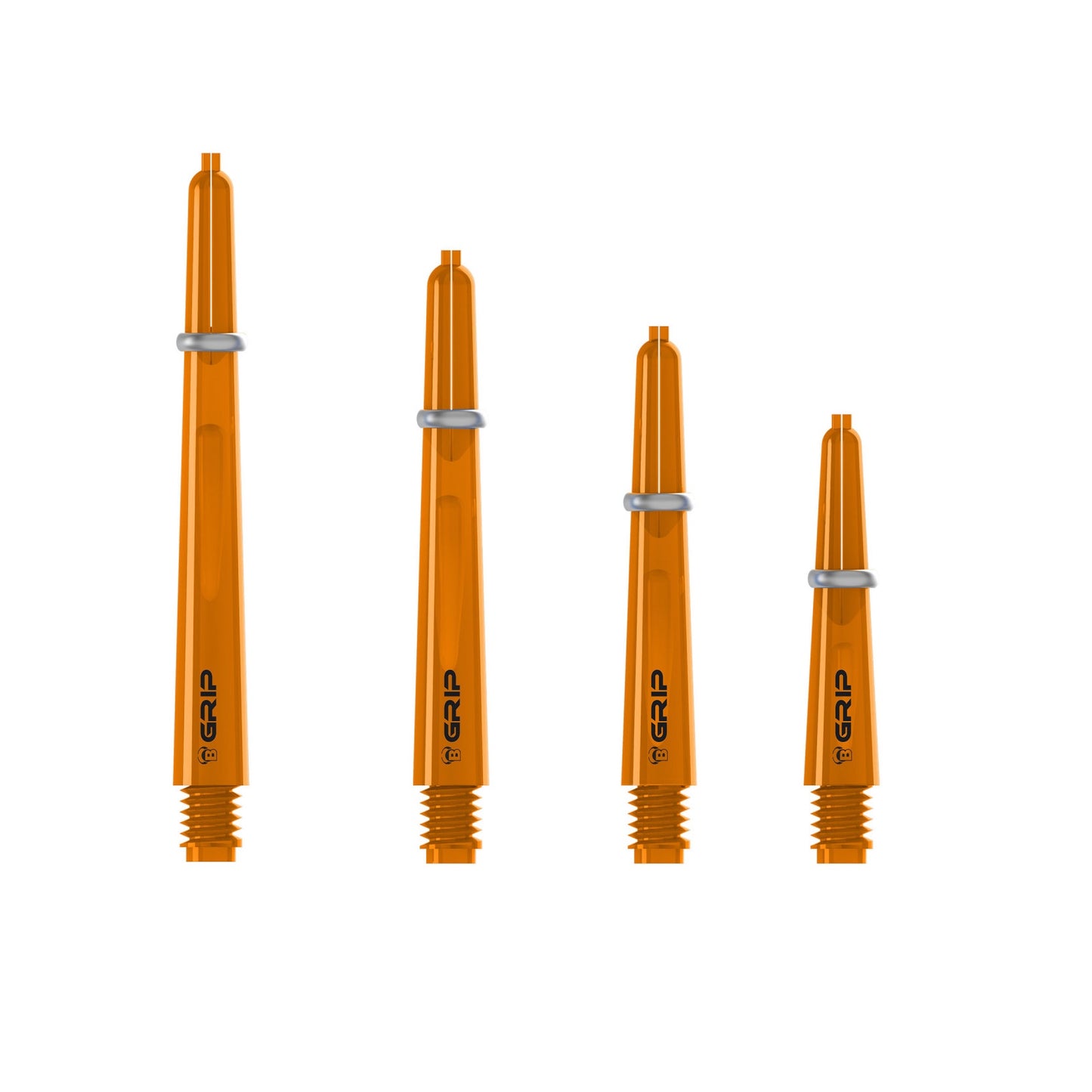 The latest iteration of Bulls B-Grip-2 CL Dart Shaft - Orange stands out for its exceptional ability to secure the flights within the shaft. Building upon the solid performance of the original B-Grip series, the new B-Grip-2 series benefits from an advanced manufacturing process that enhances flight retention even further. These shafts are not only remarkably durable but also facilitate smooth flight attachment. An included aluminium ring provides the option to further secure the flight to the shaft as needed. Every model within the B-Grip-2 lineup features the universal 2BA thread. The B-Grip-2 CL version is available in seven different colors and in the lengths m = 48mm (1.2g), i/m = 41mm (1.0g), s = 35mm (0.8g), xs = 28mm (0.7g).