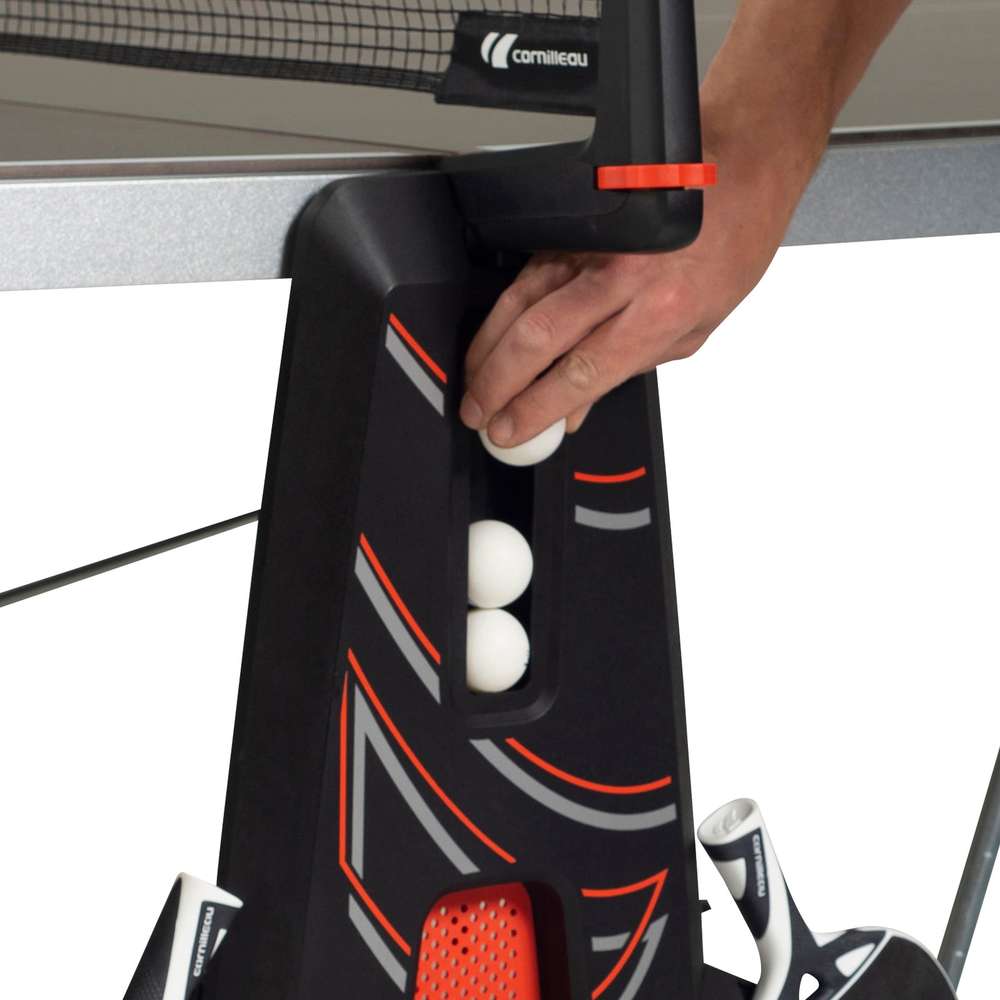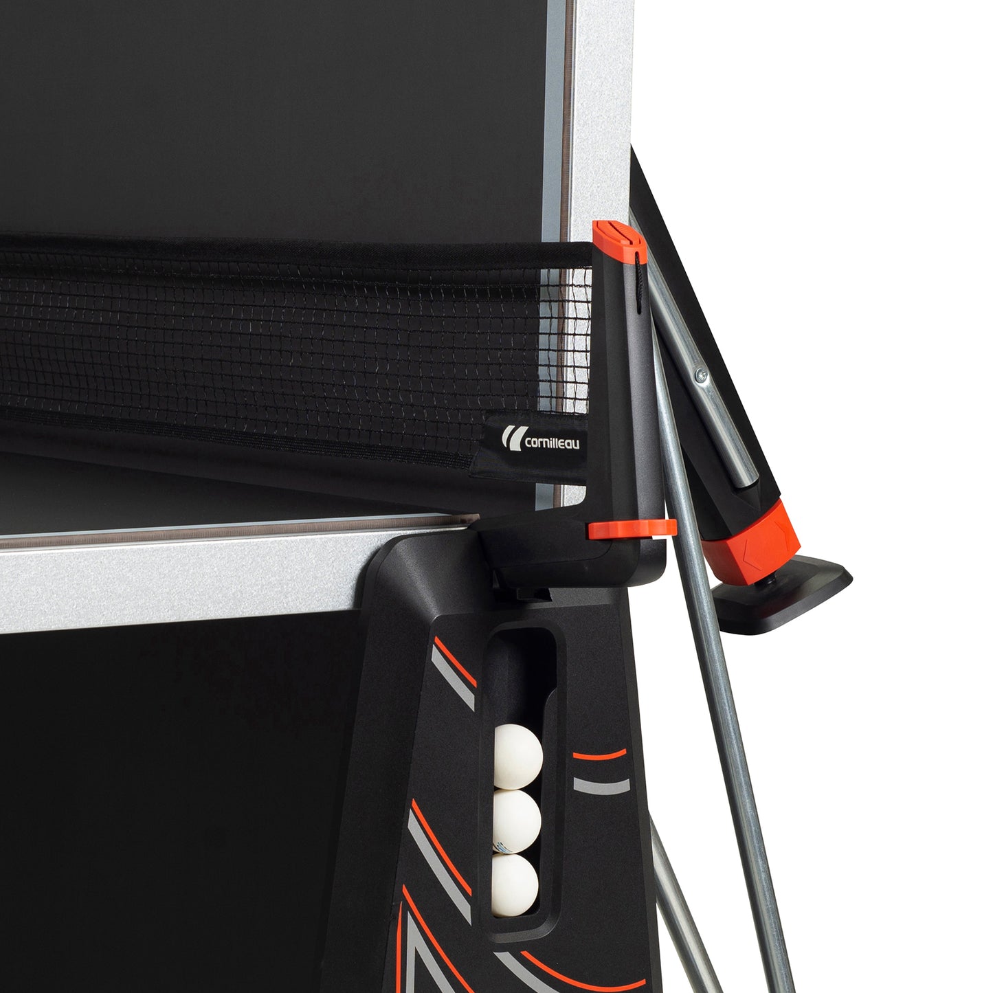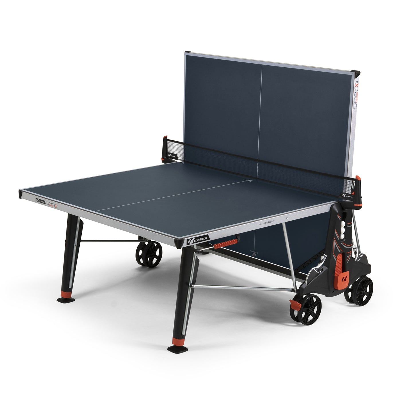 Cornilleau 500X Performance Blue Outdoor Table Tennis Table - The Performance 500X is a well-rounded table with many of the characteristics of the Performance 600X, such as the MAT top, leg levelers, corner protection pads, brakes and stylish bat and ball holders.