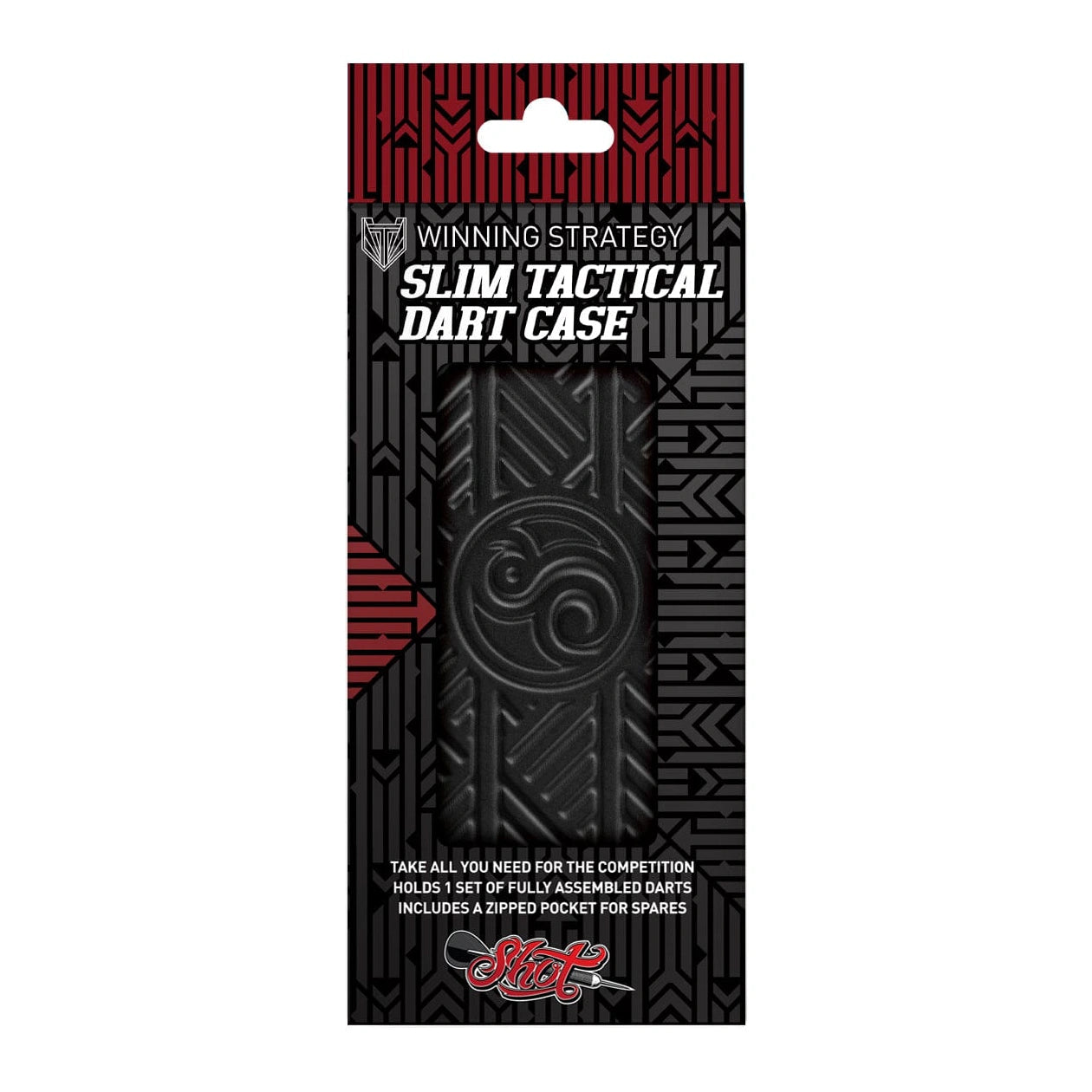 The Slim Tactical Dart Case, measuring 18cm x 8 cm, is tough yet compact, accommodating one set of fully assembled darts without risking flight damage. Featuring a quality zip closure, the case opens like a clamshell. One side is dedicated to your preferred steel tip or soft tip dart set, perfect for tournaments or friendly matches. The zipped side pocket is designed to hold accessories like dart shafts and flights, with additional space for cards and keys in the sleeve above. Keep your essentials organized and your hands free for the competition. Available in black, blue, or red with Shot's tribal design, this dart case is durable and environmentally friendly. Once retired, simply place it in your recycle bin and continue playing.