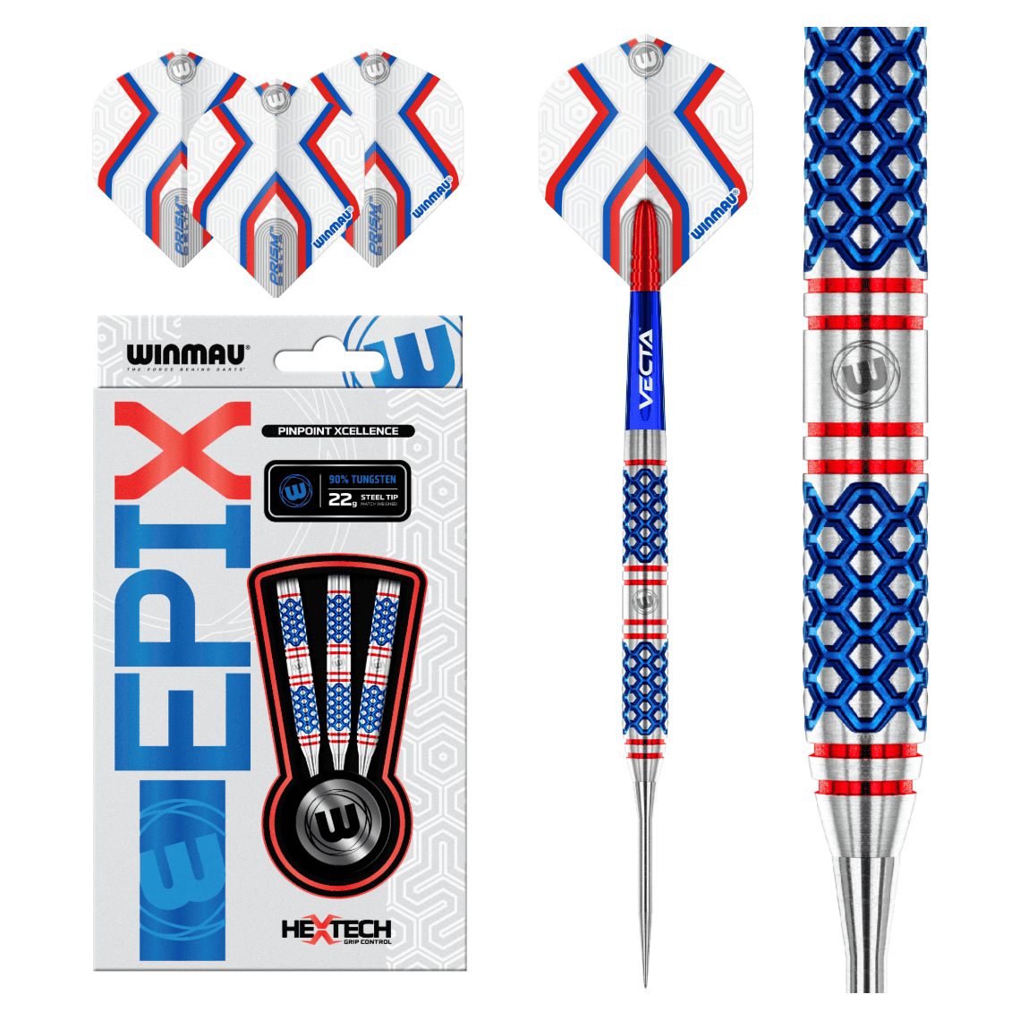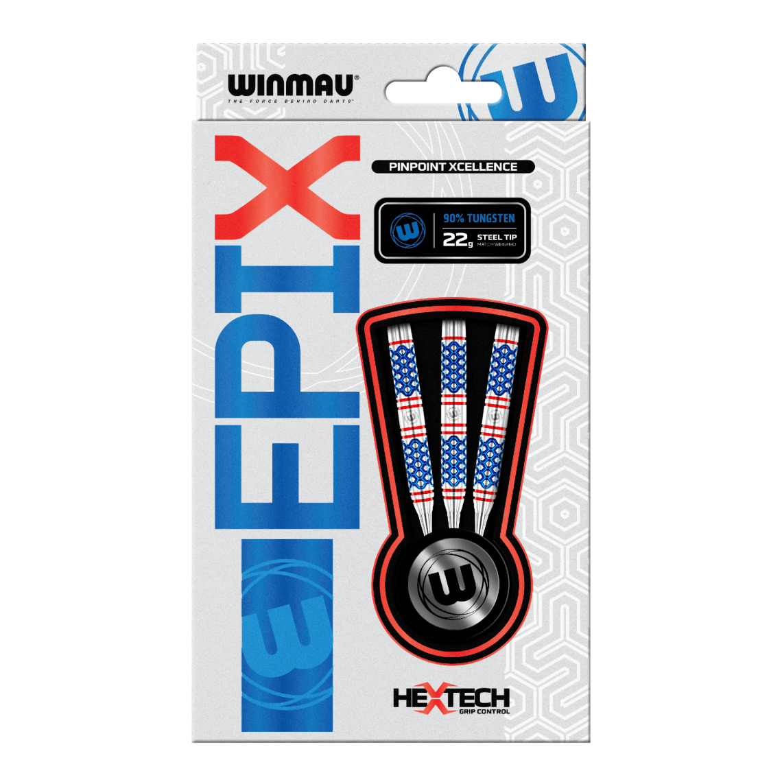 With the Winmau Epix 90% Tungsten Darts 22g experience unmatched control and confidence with the latest Hex-Tech multi-directional, multi-axis grip. Finished with striking claret and blue Vetalic detailing, these darts look as incredible as they feel. Blending performance, innovative design, and pinpoint accuracy, this set redefines the game—takes your play to the next level.